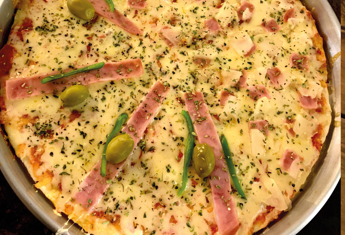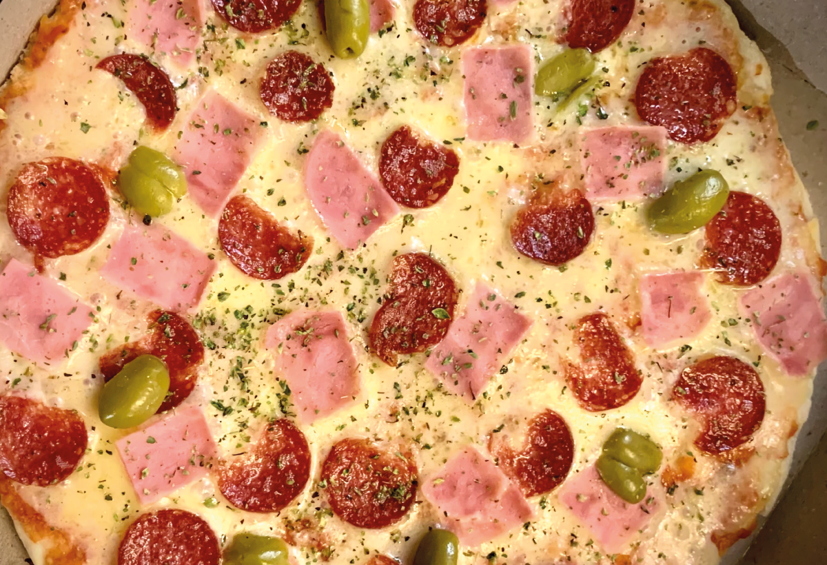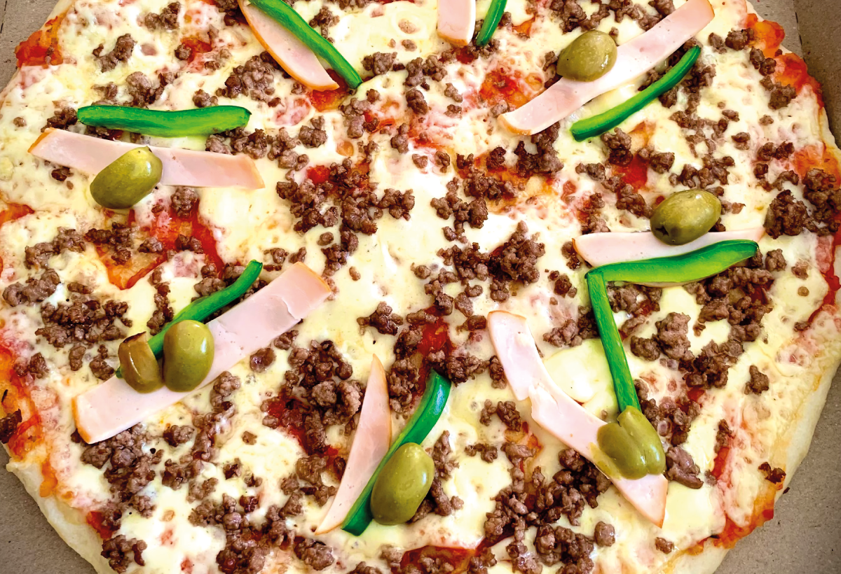 Pizza de carne, jamon, queso, morron